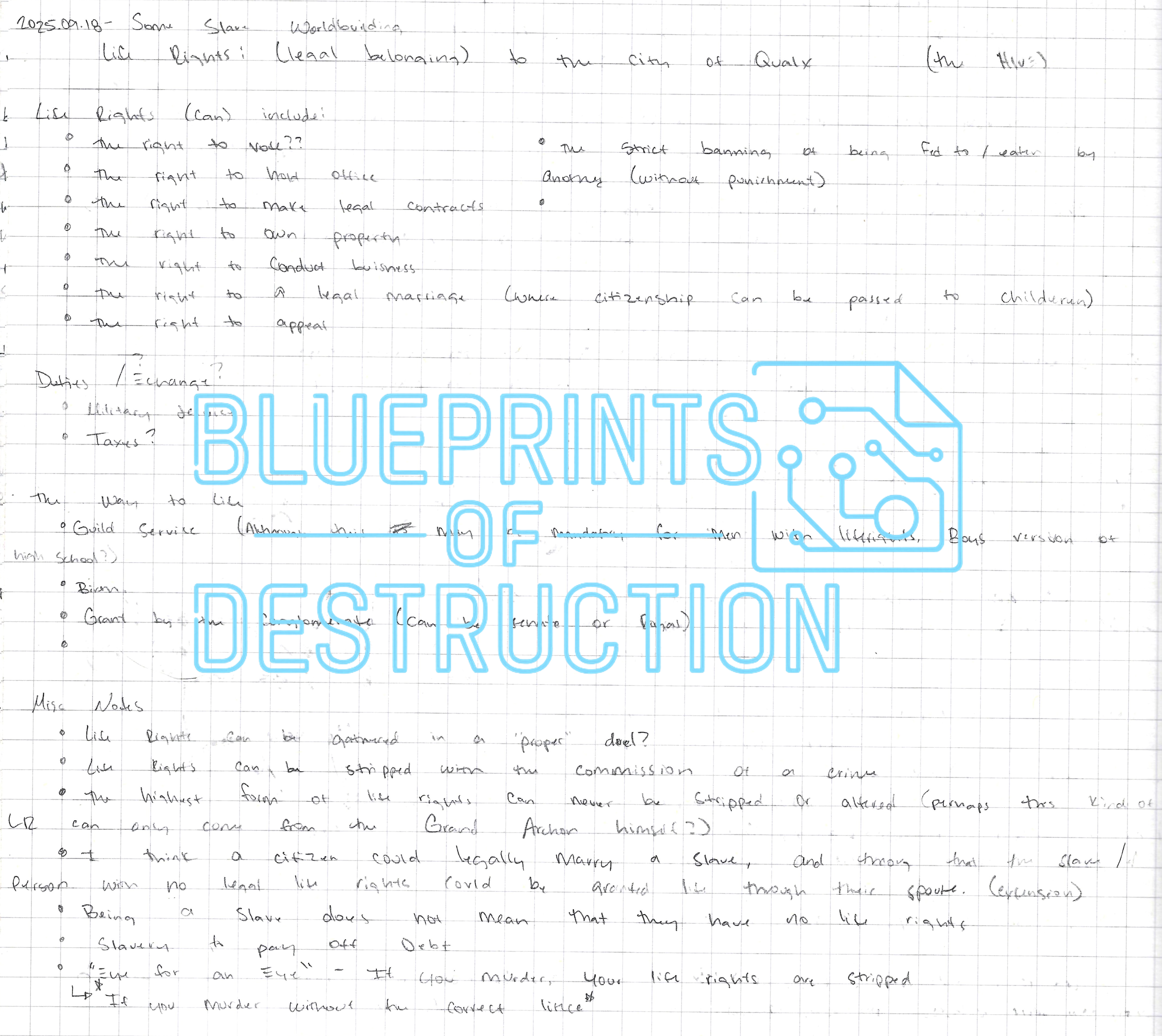 Life rights offer various risks and protections for those that possess them. There are nuances to the way it shapes how each character moves through their world. As a system, Life Rights help to explain levels of protection, ways to barter, and where a character falls in the social hierarchy of Qualx.